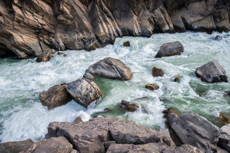 Swirling Hvira river with rock landscape photo. Beautiful nature scenery photography with water flow on background. Idyllic scene. High quality picture for wallpaper, travel blog, magazine, article