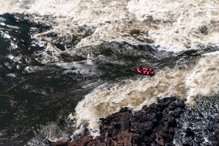 Livingstone, Zambia - August 7, 2022. A group of six people rafting down the Zambezi near Victoria falls.