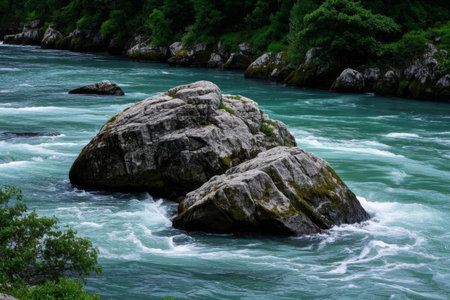 Crashing turquoise waves surround rocky outcroppings in a turbulent whitewater river, creating a dynamic close-up scene ideal for kayaking adventure and outdoor enthusiasts.