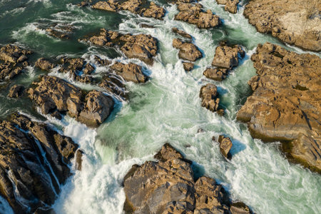 Aerial close-up captures powerful whitewater rapids surging between rugged stone outcrops at Chutes de Khone on the Mekong River in southern Laos. The swirling currents and textured rocks reveal dramatic natural patterns in the dry season landscape.