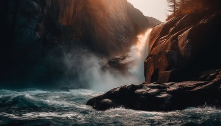 Beauty in nature Mountain range, sunset, wave, flowing water, adventure generated by artificial intelligence