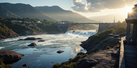 Hydropower Energy Concept A futuristic dam harnessing the power of a rushing river, glowing data streams illustrating real-time energy production. The innovative