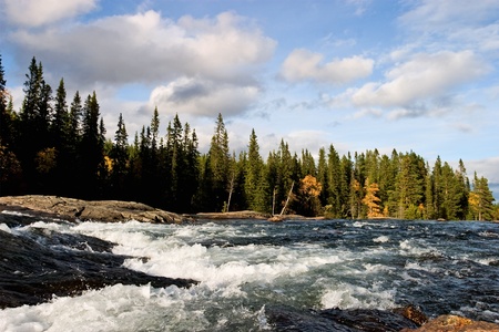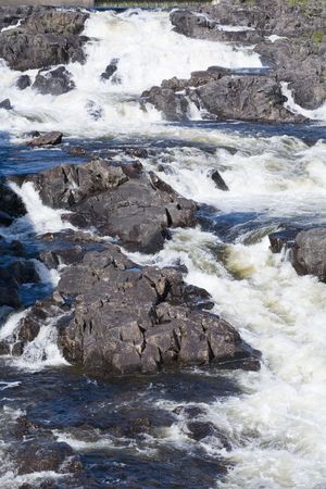 Rocky fast river. Running water, flowing with rapids, horizontal photo.
