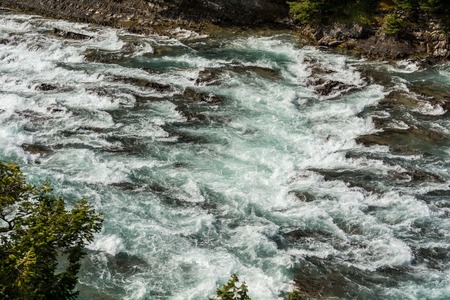 A closeup shot of the foamy turquoise water of a river illuminated with the light of the sun