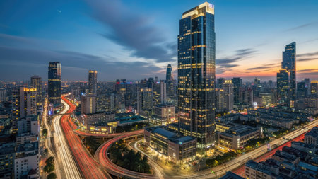 Aerial view of a bustling city skyline at sunset, with skyscrapers illuminated and a vibrant street below, creating a dynamic urban atmosphere