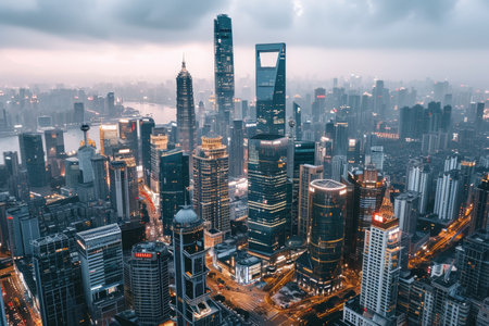 Stunning aerial shot capturing the vibrant sunset over Shanghai's skyline, showcasing modern architecture and bustling city life.