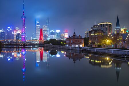 River View of the Skyline of the Pudong Area, Shanghai, China. Beautiful cityscape in the night lights.