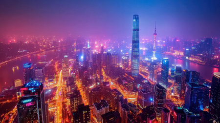 Stunning aerial view of a vibrant city skyline at night, showcasing bright neon lights and modern architecture. The atmosphere is lively and captivating.