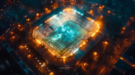 Dramatic aerial view of a soccer stadium at night, with bright lights illuminating the venue. Suitable for sports event backdrops.