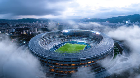Stunning aerial view of a modern stadium enveloped in fog at twilight, featuring a vibrant soccer field. A blend of urban landscape and atmospheric conditions presents a unique visual delight.