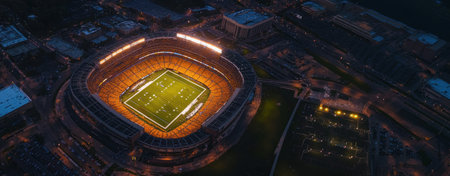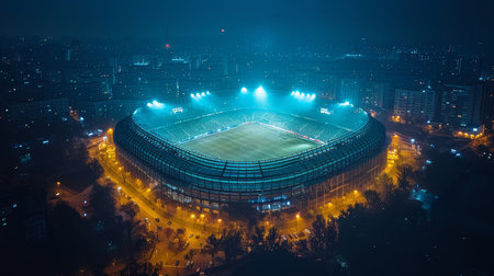 Stunning aerial view of a stadium illuminated at night, showcasing the vibrant lights and surrounding urban landscape, perfect for sports-themed visuals.