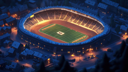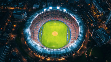 A stunning aerial shot of a vibrant stadium at night, filled with excited spectators. The bright lights illuminate the field, creating a captivating scene.