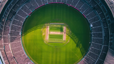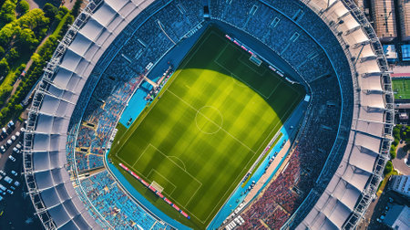 A stunning aerial perspective of a large sports stadium showcasing an enthusiastic crowd on a bright sunny day, capturing the essence of outdoor sporting events.