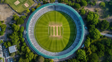 This captivating aerial image showcases a cricket stadium nestled within green mountains, highlighting the seamless blend of sports and nature.
