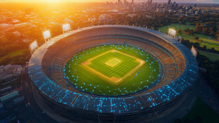 Captivating aerial view of a stadium at sunset, showcasing the empty field and surrounding cityscape. The warm light enhances the architectural beauty.