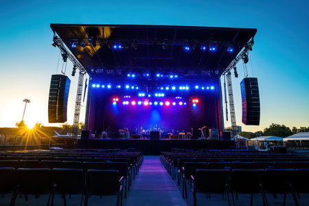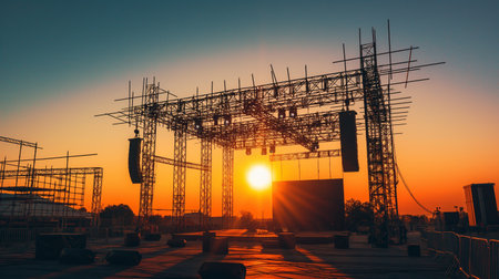 An outdoor concert stage set up at sunset, no audience, ample copy space for branding