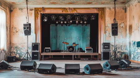An empty historic theater stage set for a concert performance, featuring vintage sound equipment and a unique backdrop. Perfect for event promotions or music-related projects.