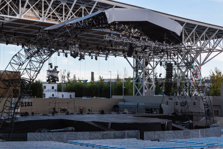 Open-air concert stage setup with minimal design and vibrant lights, ideal for music events and modern entertainment visuals.