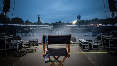 A director's chair is positioned in the foreground, facing a large stage being prepared for an event. The stage features lighting equipment and a backdrop with smoke effects. Surrounding the chair are various cases and equipment, indicating a busy production setup. The sky is clear with a few clouds, suggesting it is either early morning or late afternoon.