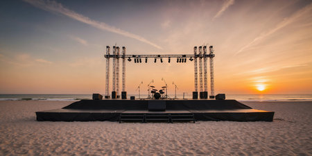 Empty concert stage with equipment set up on a sandy beach against a breathtaking sunset backdrop. for music festival promotions, summer event planning, or beach vacation advertisements.