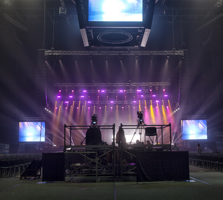 Stage lights, spotlights and lighting equipment on a concert stage.