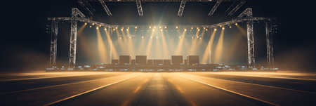Empty concert stage with illuminated spotlights and smoke. Stage background with copy space AI generated