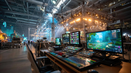 A high-tech gaming setup featuring multiple screens, vibrant lighting, and control equipment in a busy event venue, showcasing the future of entertainment.