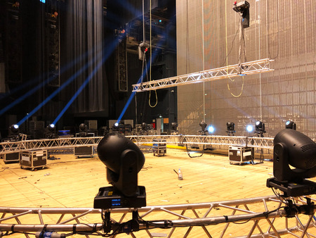 Installation of professional sound, light, video and stage equipment for a concert. Stage lighting equipment is clamped on a truss for lifting. Flight cases with cables.