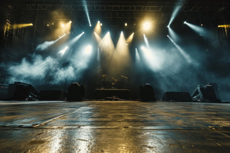 An electrifying scene featuring an empty stage for a rock concert, bathed in vibrant lights from powerful projectors, setting the stage for an epic and energetic performance.
