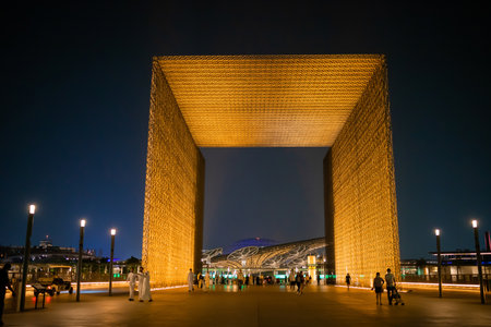 Dubai, United Arab Emirates - November 06, 2021: Entrance gate of Terra Sustainability Pavilion at the EXPO 2020 in the United Arab Emirates at night lights