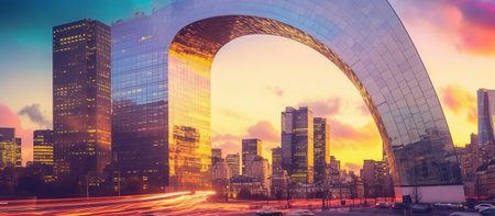 Paris, France - September 12, 2022 Cityscape and architecture of La Defense, a business district located in Greater Paris, skyscrapers surround the famous arch in the center of the esplanade