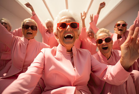 Elderly individuals are sharing joyful laughter in a black and white portrait, capturing the essence of happiness and connection among friends.