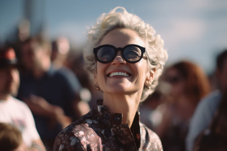 Portrait of a fashionable elderly lady with vibrant attire in a lush garden setting