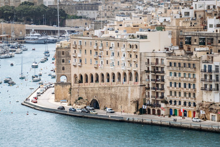 Valletta, Malta - April 10, 2025: Coastal apartment buildings and arched waterfront promenade along Grand Harbour