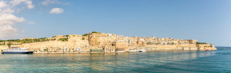 Panorama of Valletta Grand Harbour with medieval city's skyline, preserved fortifications and floating ships, Malta.