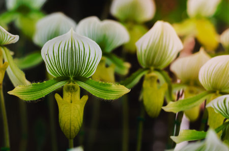 Colorful Paphiopedilum slipper or Lady slipper orchid blooming in the garden.