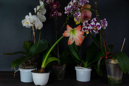 Orchid flower spike by the window under artificial light in winter, Phalaenopsis flower buds closeup