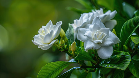 A delicate white flower stands at the center, enveloped by lush green leaves creating a serene and harmonious scene.