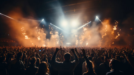 Stage lights and crowd of audience with hands raised at a music festival. Fans enjoying the party vibes.