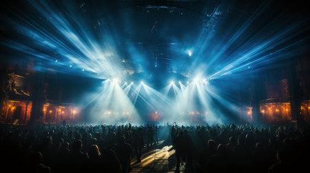 A crowded concert hall with scene stage lights, live show performance, with people silhouette, dance floor during a concert open-air festival