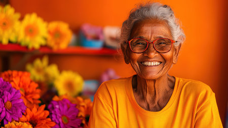 A portrait of an elderly woman with gray hair and glasses, wearing a floral blouse and smiling warmly The background is a vibrant orange This photo captures the beauty and wisdom of age AI Generative
