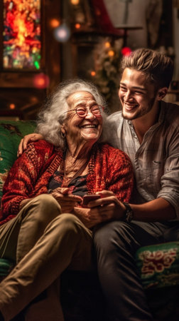An older woman is sitting on a couch, holding a small child in her arms. The woman and child are both looking towards the camera, with a warm and caring expression on their faces. The setting appears to be a cozy living room with soft lighting.