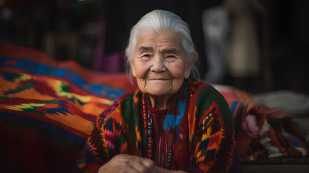A heartwarming portrait of an elderly woman with silver hair and a young boy with blonde hair, both wrapped in colorful, patterned shawls, reflecting a deep bond.