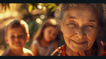 Family groups, multigenerational households, great-grandmother and great-grandchildren. Candid portrait of happy grandmother with grandchildren outdoors