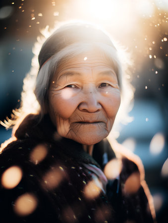 Portrait of an elderly asian woman wearing orange jacket and glasses.