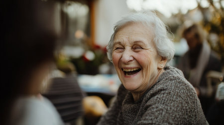 A candid shot of an elderly woman laughing with family, her face lit up with joy and showcasing the character lines of a life well-lived