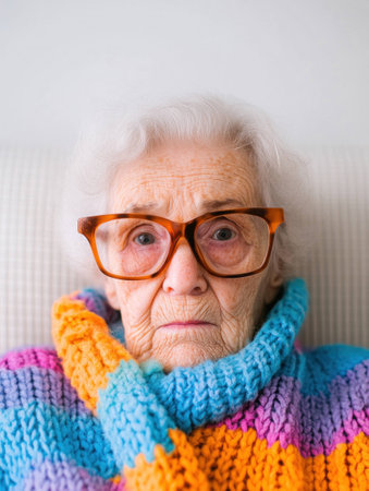 Senior woman in colorful knitted sweater with large glasses, expressing deep emotions and wisdom, sitting in a bright indoor setting