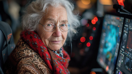 An older woman wearing glasses and a sweater is looking up, AI