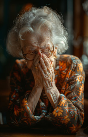Senior woman weeps alone at table, hands hiding her face, sorrow filling the room
