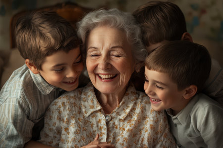 Grandmother enjoys a heartwarming moment surrounded by her laughing grandchildren in a warm, inviting room.